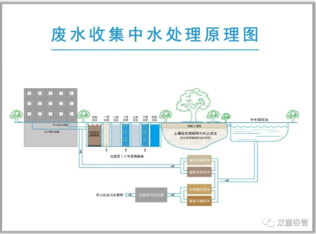 最后,經(jīng)過處理的水可以達(dá)到了三類水的標(biāo)準(zhǔn),不能直接飲用和觸碰皮膚,但可以用于廠區(qū)綠化噴淋、所有洗手間抽水馬桶沖洗用水和道路清洗。這讓員工日常生活中所產(chǎn)生的廢水不僅得到循環(huán)利用,而且還消滅了企業(yè)的廢水排放和污染,同時一年還能為企業(yè)節(jié)省了三百多萬的費用,讓600人的工廠不用一噸自來水! “雙童”一期廠區(qū):廢水收集處理循環(huán)利用示意圖