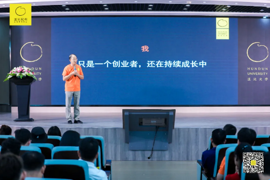 賈光校長(zhǎng)分享之后,“雙童”樓仲平上臺(tái)做了個(gè)簡(jiǎn)短的分享。樓仲平以“感恩、感謝”為開(kāi)場(chǎng),向所有混沌義烏的同學(xué)們表示了感謝的心情,混沌義烏學(xué)習(xí)中心至今已成立近一年的時(shí)間,每一個(gè)腳步都基于在場(chǎng)所有學(xué)員的支持。