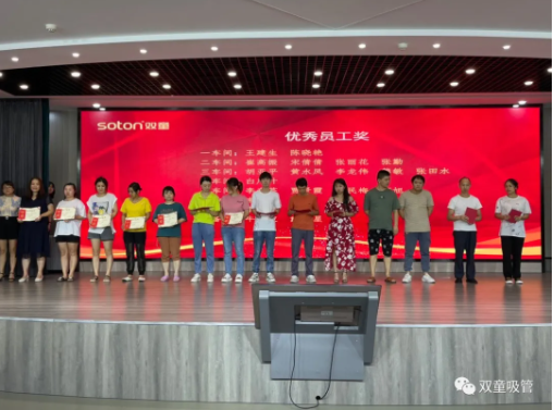 頒獎環(huán)節(jié)開始,由主持人“吸管妞”宣讀第二季度優(yōu)秀員工名單,由“雙童”總經(jīng)理李二橋給他們頒發(fā)了獎狀和紅包并合影留念。