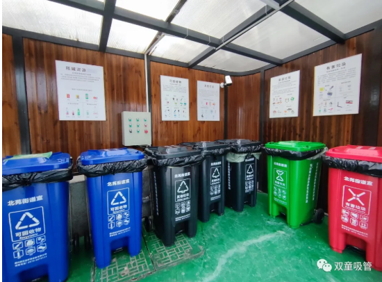 “雙童”垃圾投放房內的垃圾箱 “雙童”的后勤人員會在每天的8:00至10:00對垃圾房進行整理。對于其中的可回收物,清潔員會進行二次回收和變賣,出售后的收入也將作為清潔員的獎金發(fā)放!