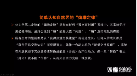 “熵”,是來(lái)自于物理學(xué)熱力學(xué)第二定律的一個(gè)詞。“熵增定律”意指在任何“孤立而封閉”系統(tǒng)中,其系統(tǒng)無(wú)序度必然增加,最終會(huì)達(dá)到“熵”的最大值“死寂”。簡(jiǎn)單理解就是:任何一個(gè)人,任何一個(gè)組織,乃至于任何一個(gè)家庭,如果你把自己封閉起來(lái),你的內(nèi)部一定是從有序到無(wú)序。如果你繼續(xù)封閉,它的混亂程度一定會(huì)達(dá)到最大值,一直到死寂。“雙童”樓仲平也曾多次在課程分享中引用熱力學(xué)第二定律的“熵增定律”,把“雙童”存在的問(wèn)題通過(guò)自然的現(xiàn)象加以挖掘、頗析、呈現(xiàn)、對(duì)照,從而來(lái)尋求問(wèn)題解決的方法。樓仲平分享的“熵增定律”P(pán)PT頁(yè)面