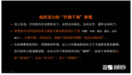 對(duì)于企業(yè)而言其實(shí)也是如此,如果一個(gè)企業(yè)總是在封閉而孤立當(dāng)中,其組織關(guān)系也必然從簡(jiǎn)單走向復(fù)雜,并逐漸陷入混亂、無(wú)序和僵化,逐漸失去活力直至走向了“死亡”。而避免“熵增”的唯一方法就是管理者持續(xù)開(kāi)放和組織干預(yù),從而打破平衡,持續(xù)加壓、刺激個(gè)體和組織喚醒“危機(jī)反饋機(jī)制”,從而讓個(gè)體和組織遠(yuǎn)離“舒適區(qū)”,走向“學(xué)習(xí)區(qū)”,進(jìn)入“恐慌區(qū)”,原有惰性才能逐漸逆轉(zhuǎn),從而煥發(fā)出新的活力!樓仲平分享的“熵增定律”P(pán)PT頁(yè)面