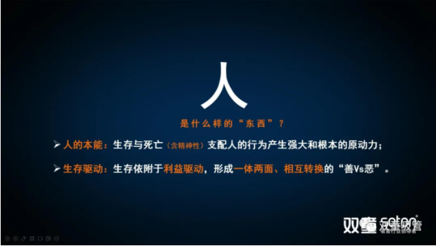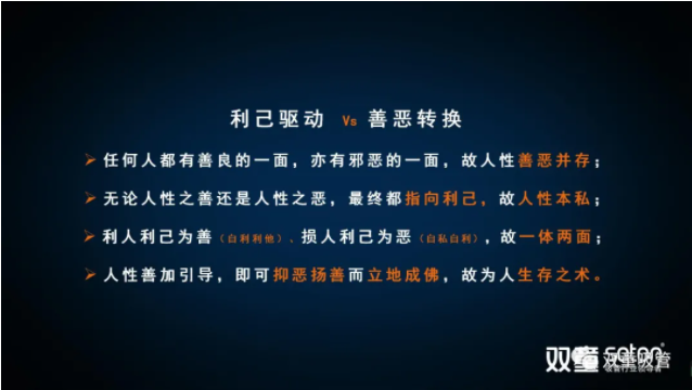 從上圖中大家可以看到,無論人性之善還是人性之惡,其實都包含“利己驅(qū)動”。“利己”是人在長期的自然環(huán)境中為了獲得生存不得不獲得更多外部資源的內(nèi)在驅(qū)動力,從而導(dǎo)致人總是會從利己的角度去考慮如何更快、更多的獲得。所以“人性本私”是無可非議的。