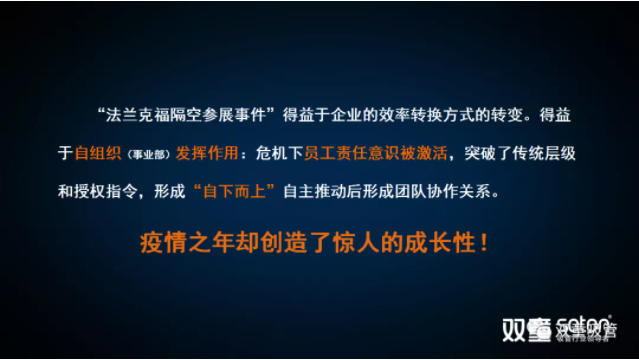 隨后,樓老師通過“法蘭克福隔空參展事件”,讓大家深刻意識到這種機(jī)制催生的巨大活力?!半p童”第三事業(yè)部在2020年2月疫情危機(jī)下,自主經(jīng)營的員工責(zé)任意識被激活,在眾多不利環(huán)境下突破了傳統(tǒng)層級和授權(quán)指令,實現(xiàn)“自下而上”推動后形成了緊密的團(tuán)隊協(xié)作關(guān)系。在眼看參展無望的絕境下竭盡所能,核心成員通過創(chuàng)新方式和遠(yuǎn)程視頻遙控的方式聘請德國慕尼黑工業(yè)大學(xué)的留學(xué)生全程參展,從而獲得了五年以來最好的參展效果,在疫情之年取得了驚人的成長性。
