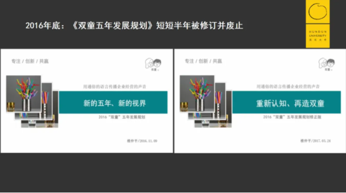 但2015年以后,在持續(xù)增長受限的現(xiàn)實情況下,我們逐漸意識到原來的“經(jīng)驗”已經(jīng)逐漸失效,原本所謂的“成功模式”已經(jīng)不適用于“雙童”未來發(fā)展訴求。面對時代的不確定性,雙童第四個《五年發(fā)展規(guī)劃》短短半年被修訂并廢止,并明確后續(xù)不再推行《五年發(fā)展規(guī)劃》。