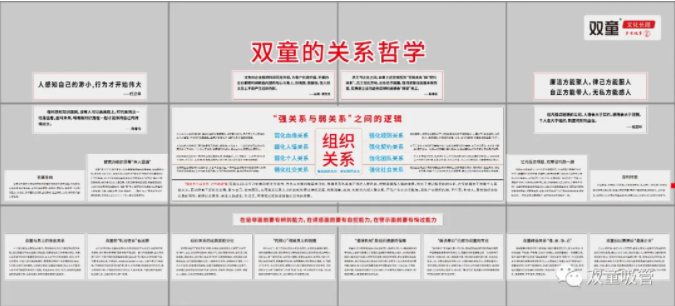 通過強化企業(yè)健康的社會關(guān)系,從而凸顯團隊的組織價值和社會效應(yīng),將老板從繁雜的事物和社交關(guān)系中解脫出來,有更多的聚焦去做應(yīng)該做的事情。在“雙童”敢于放權(quán)授權(quán)??蛻魜砹?,由銷售團隊去鏈接;交流伙伴來了,由文化宣傳團隊負責接待。