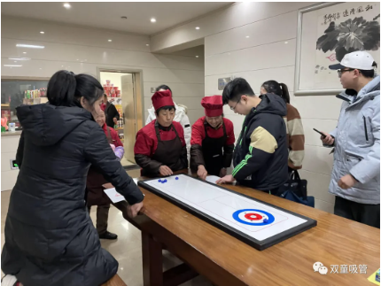 桌上冰壺看起來不大,難度系數(shù)卻爆表了!吸管妞試過幾次都沒能成功,一下子對冰壺這個游戲肅然起敬了!然而,讓吸管妞感到意外的是,“雙童”的“選手們”卻紛紛在游戲現(xiàn)場大顯神通,讓妞大開眼界!