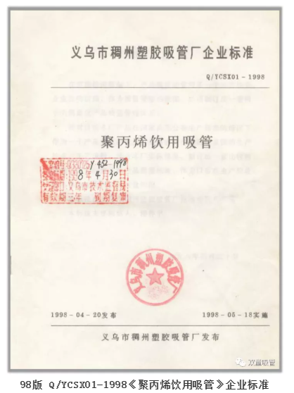 終于在1997年10月,由“雙童”前身的義烏市稠州塑膠吸管廠起草的《聚丙烯飲用吸管》企業(yè)標準順利通過審核,于1998年4月正式發(fā)布,成為吸管行業(yè)最早的產(chǎn)品標準。從此,“雙童”打開了產(chǎn)品在商超場所的銷售渠道,實現(xiàn)了傳統(tǒng)家庭作坊企業(yè)向正規(guī)工廠的轉(zhuǎn)型。