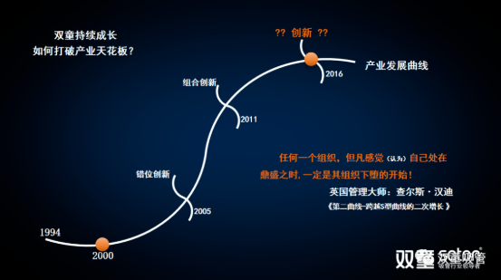 “雙童”從2011年底啟動的“再造經(jīng)理人”組織變革,于2015年底全面完成。重新組建的“雙童”行政團(tuán)隊(duì)在當(dāng)時(shí)平均年齡不到30歲,核心團(tuán)隊(duì)的大部分都是90后,新生代員工已成為“雙童”的核心管理骨干。借由2011年的五年發(fā)展規(guī)劃,“雙童”實(shí)現(xiàn)了現(xiàn)代化企業(yè)組織變革,解決了作為傳統(tǒng)企業(yè)的“老、大、難”問題。