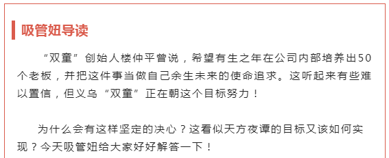 除了最直接的物質(zhì)激勵,更能激發(fā)創(chuàng)造力的是建立使命感。底層基于利益,高層基于使命,個體的聰明代替不了集體的智慧,要使工作有效率,就要讓員工有意愿。“雙童”推行以人為本的機制創(chuàng)新,喚醒全體員工從內(nèi)心參與創(chuàng)造的動力和活力,從而打破邊界,建立互為主體、資源共享、價值共創(chuàng)的“利益共同體”。