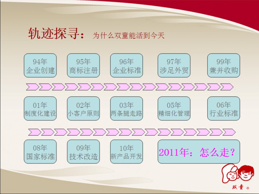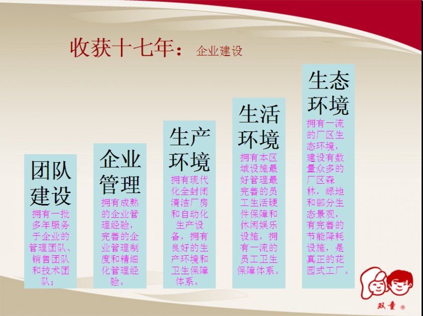 回首過去才能評判現(xiàn)在展望未。9月13日下午的培訓(xùn)課上,樓總主要對《讓雙童走好下一個十年》的企業(yè)規(guī)劃進行了講解,樓總首先用PPT向所有管理人員總結(jié)了雙童在過去17年中的成績和經(jīng)驗。