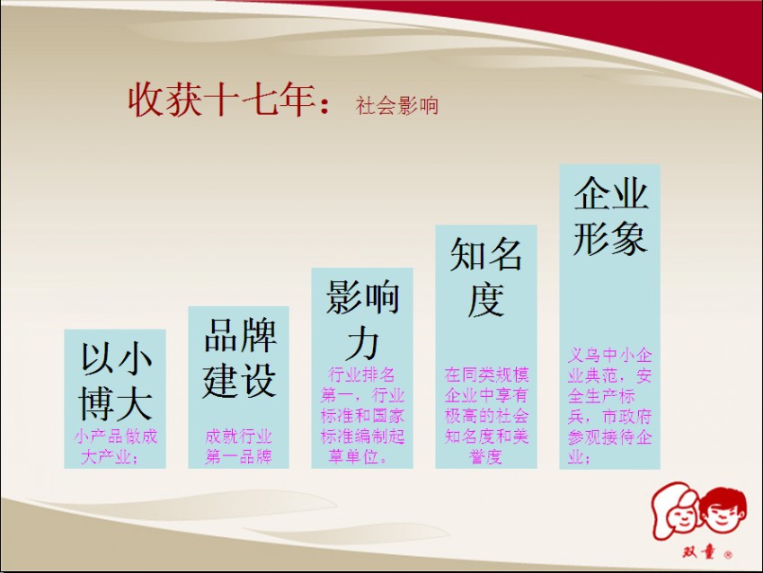 距離2006年雙童的上一個五年規(guī)劃已經(jīng)五年過去了,在這五年中,雙童完成了行業(yè)標(biāo)準(zhǔn)、國家標(biāo)準(zhǔn)的建立,成為吸管行業(yè)國家標(biāo)準(zhǔn)的起草單位;企業(yè)形象和美譽度得到很大提升,多次被中央電視臺、央視新聞聯(lián)播等節(jié)目專題報道,被譽為“義烏傳奇”;建設(shè)了義烏工商界首座集綠化和節(jié)能為一體的公司行政大樓,綠色環(huán)保功能得到傳媒界、企業(yè)界的廣泛報道和參觀;獲得了“浙江名牌產(chǎn)品”、“金華市知名商號”、“義烏市百強企業(yè)”、浙江省“清潔生產(chǎn)示范企業(yè)”、“節(jié)能降耗先進單位”、“最具社會責(zé)任企業(yè)”等等殊榮。