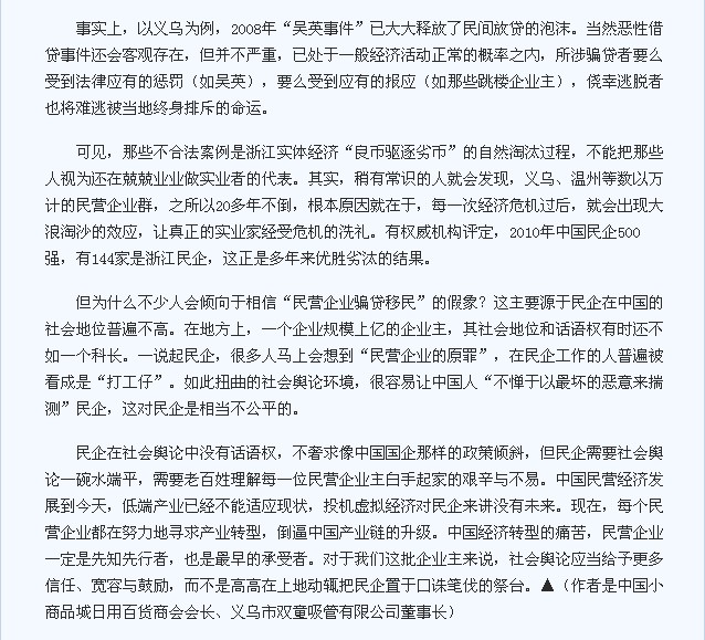 幾天前,某報(bào)以調(diào)查的口吻,刊登了一篇題為“義烏老板曝光海外轉(zhuǎn)移資產(chǎn)鏈條 實(shí)業(yè)抵押假破產(chǎn)真移民”的長篇報(bào)道,被幾十家網(wǎng)絡(luò)媒體轉(zhuǎn)發(fā)。一時(shí)間,繼9月份溫州數(shù)十家企業(yè)主外逃事件之后,浙江民營企業(yè)再次被推到了中國輿論的風(fēng)口浪尖。