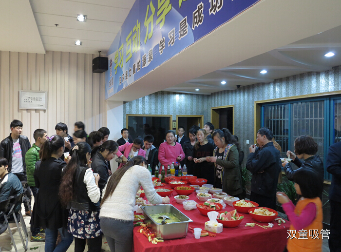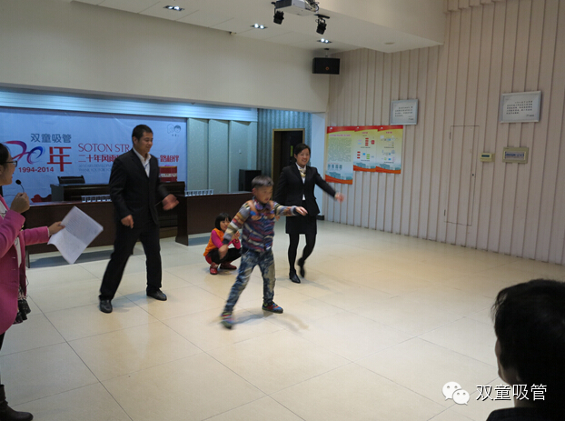 首先,這期生日會的第一個不同之處,就是參與生日會的人員注入了新鮮的血液!我們請來了第三代雙童人——隨父母居住在雙童的孩子們,為壽星們跳了一段熱情洋溢的舞蹈——《小蘋果》!看著孩子們駕輕就熟的表演,吸管妞也鬼馬地讓他們的“生產(chǎn)商”廠長李秀前和廠長夫人上臺,讓孩子們教兩位如何跳“小蘋果”!一番折騰下來,不僅讓在座的各位壽星笑得前仰后合,更讓跳的手腳不知道怎么放的廠長李秀前感嘆道:長江后浪推前浪,前浪死在沙灘上??!
