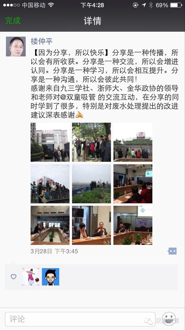 當(dāng)家人在朋友圈里發(fā)了感慨:分享是一種傳播,所以會有所收獲。分享是一種交流,所以會增進認同。分享是一種學(xué)習(xí),所以會相互提升。分享是一種溝通,所以會彼此共通!感謝來自九三學(xué)社、浙師大、金華政協(xié)的領(lǐng)導(dǎo)和老師對@雙童吸管 的交流互動,在分享的同時學(xué)到了很多,特別是對廢水處理提出的改進建議深表感謝!