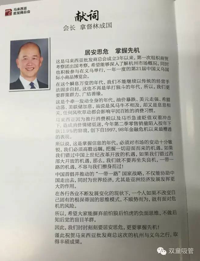 馬來西亞批發(fā)商總會(huì)是由一批參與批發(fā)與零售相關(guān)事業(yè)的人士發(fā)起成立的組織,此次來義烏,是該會(huì)成立3年以來,第一次組織商貿(mào)考察團(tuán)出國考察,希望能夠深入了解杭州市場概況,同時(shí)也積極參與我們義烏的第21屆義博會(huì)。