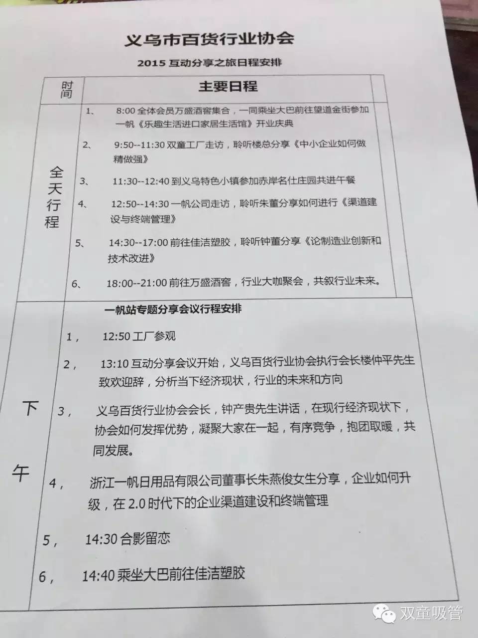 上周六,義烏百貨協(xié)會(huì)舉辦了一場(chǎng)企業(yè)互動(dòng)之旅,四十多名百貨行業(yè)的企業(yè)家們自發(fā)組隊(duì),在行業(yè)協(xié)會(huì)的各位領(lǐng)導(dǎo)人帶領(lǐng)下,參觀了幾家行業(yè)龍頭企業(yè),相互交流企業(yè)經(jīng)營(yíng)管理經(jīng)驗(yàn),促進(jìn)企業(yè)的共同發(fā)展。這是吸管妞偷拍的當(dāng)天行程表,給大家透露一下!