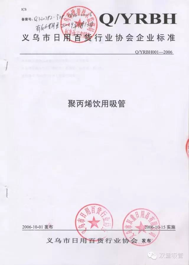 2006年9月,雙童完成了《聚丙烯飲用吸管》和《一次性塑料飲用杯》行業(yè)標準的起草編制工作,成為了當時義烏歷史上第一件行業(yè)標準!