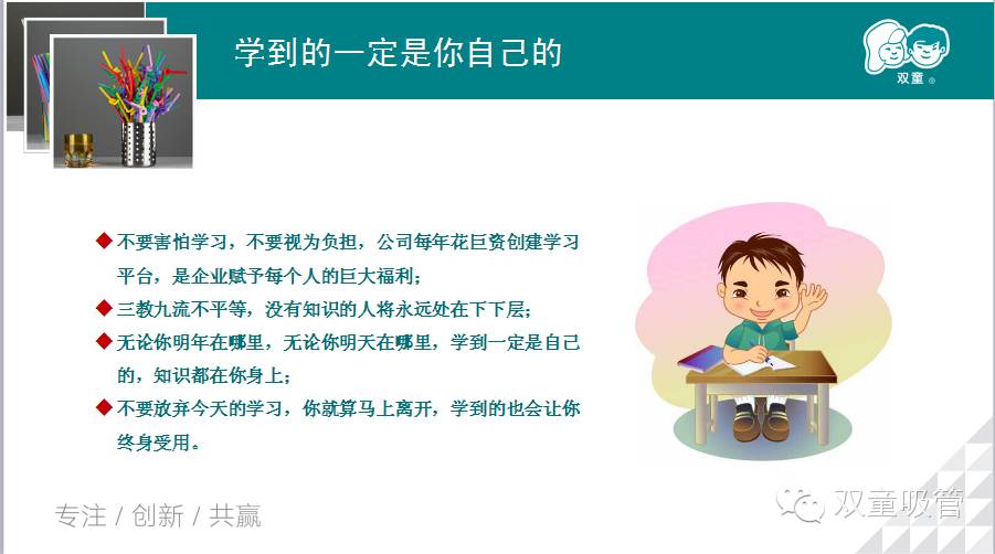 接下來樓總又分享了自己的成長經(jīng)歷,以自己的親身實(shí)例向大家說明了一句話:只要肯努力,肯學(xué)習(xí),通過不斷地積累和改變,下一個(gè)老板可能就是你呢!同時(shí)也分享了“雙童”核心層的成長之路,這些從基層做起和雙童一起奮斗了十幾年的伙伴們也在不斷學(xué)習(xí)、不斷進(jìn)取,不斷融入。雙童也因有大家而更精彩!