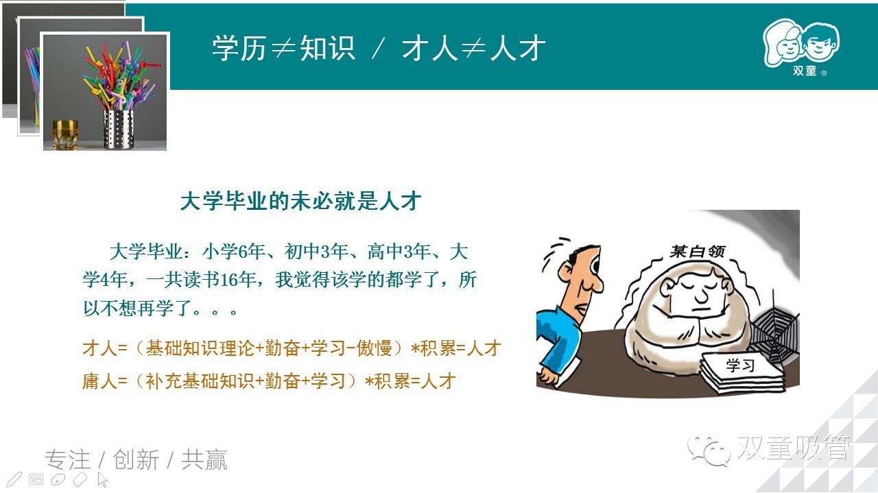 當(dāng)家人樓總勉勵(lì)大家,一定要堅(jiān)持學(xué)習(xí),學(xué)習(xí)并不是學(xué)校里才需要做的事!如果工作以后就不思進(jìn)取,不學(xué)習(xí)提升,就算是博士生,雙童也不會(huì)對(duì)你敞開(kāi)大門(mén)!而對(duì)于那些肯學(xué)習(xí)、肯鉆研的員工,雙童會(huì)提供非常多的學(xué)習(xí)機(jī)會(huì)和提升空間,讓你在雙童有一個(gè)更好的發(fā)展!就算有一天你離開(kāi)了雙童,你學(xué)到的始終是你自己的!真摯的話語(yǔ)深深地感染了在座的員工們,相信以后雙童的學(xué)習(xí)氛圍會(huì)更好!