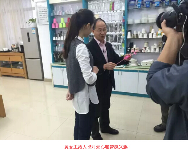 節(jié)目組剛來“雙童”第一次踩點(diǎn)時(shí),導(dǎo)演哈敏就“看上了”我們的當(dāng)家產(chǎn)品愛心吸管。這可是我們雙童目前單價(jià)最高,也最復(fù)雜的一款創(chuàng)新產(chǎn)品呢!小小一根吸管,有20多個(gè)零件組成,可以供兩個(gè)人飲用,而且完美避免了液體回流和細(xì)菌交叉感染的問題。再看看外形,一個(gè)紅彤彤的愛心,在第一時(shí)間就抓住了你的眼球,讓你心跳都加快了,難怪我們的主持人美女也對這款產(chǎn)品愛不釋手,讓當(dāng)家人在錄制時(shí)重新介紹一遍呢!