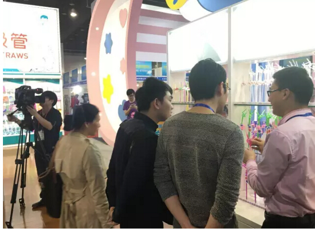 經(jīng)過雙童經(jīng)過的客商基本都會(huì)留下腳步。原來是雙童展位的正中央掛著一臺(tái)大尺寸的電視機(jī),不間斷的滾動(dòng)播放當(dāng)家人接受的各類節(jié)目采訪,以及各類媒體對(duì)雙童吸管進(jìn)行報(bào)道的視頻!看來咱們當(dāng)家人的魅力還真是大呀!