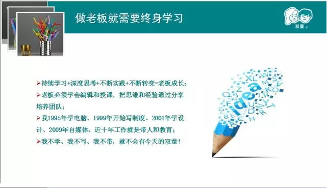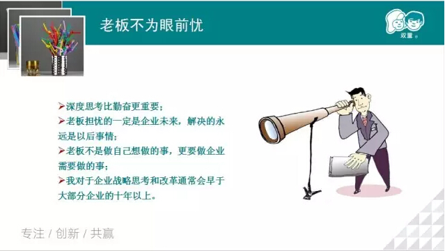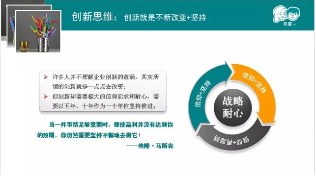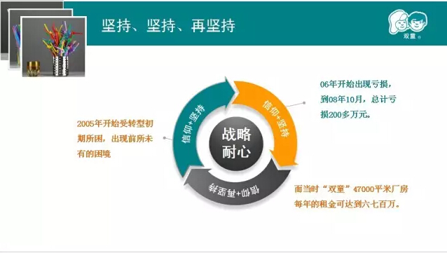 我們強(qiáng)調(diào)戰(zhàn)略思考、戰(zhàn)略規(guī)劃、戰(zhàn)略部署,唯獨(dú)缺少戰(zhàn)略內(nèi)心。2005、2006、2007年雙童連續(xù)三年虧損,但是雙童堅(jiān)持小客戶原則,堅(jiān)持對員工投入,堅(jiān)持走差異化的道路,雙童的發(fā)展也越來越好。有人說創(chuàng)新太難了,要去發(fā)明;也有人說創(chuàng)新太難了,要去顛覆。創(chuàng)新,沒有那么復(fù)雜,微創(chuàng)新、局部改良都是創(chuàng)新。創(chuàng)新就是改變,就是持續(xù)積累。
