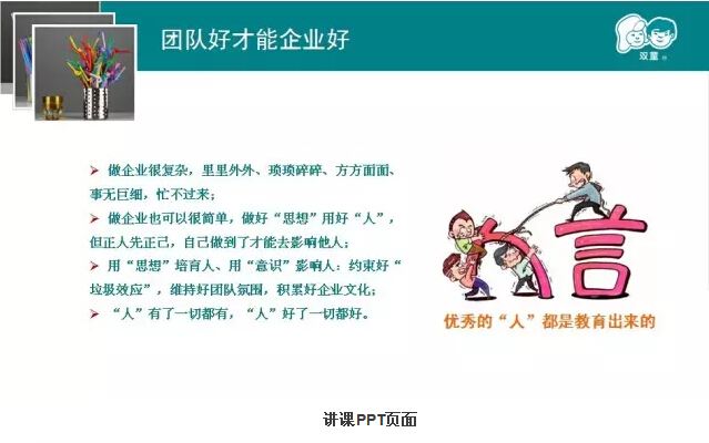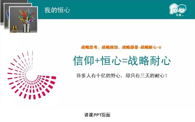 樓總認(rèn)真地準(zhǔn)備了PPT,講述了他的“匠人”之心。從早期創(chuàng)業(yè)過程的搖擺不定談到雙童吸管發(fā)展的堅(jiān)定;從開始的規(guī)?;笈可a(chǎn)講到差異化和品牌化經(jīng)營,從小商思維談到經(jīng)營哲學(xué);他回顧了雙童吸管二十多年的發(fā)展歷程,講到了他所推崇和堅(jiān)持的“三心”,也道出了吸管大王背后的堅(jiān)守和追求。