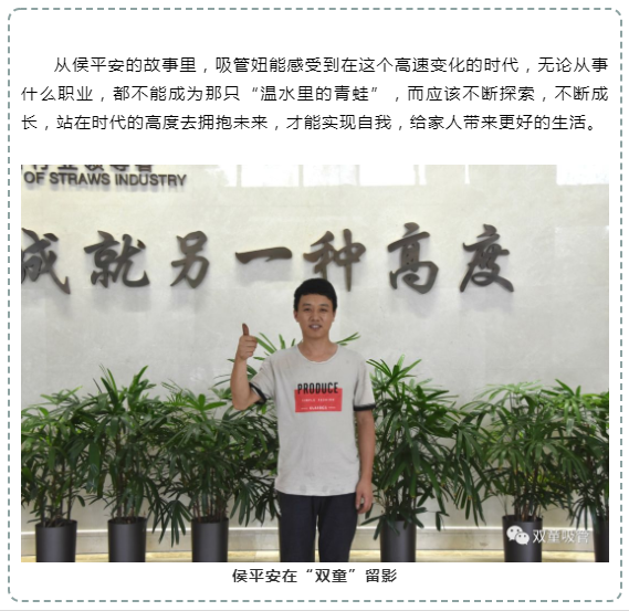 在確保基礎(chǔ)機(jī)器設(shè)備運(yùn)行的同時(shí),侯平安也不斷挑戰(zhàn)自己,跳出“舒適區(qū)”,參與公司的設(shè)備更新及轉(zhuǎn)型升級(jí)工作。2004年,侯平安參與了藝術(shù)吸管成型機(jī)器的研發(fā),2018年,他又負(fù)責(zé)了紙吸管新機(jī)器的安裝和調(diào)試工作。