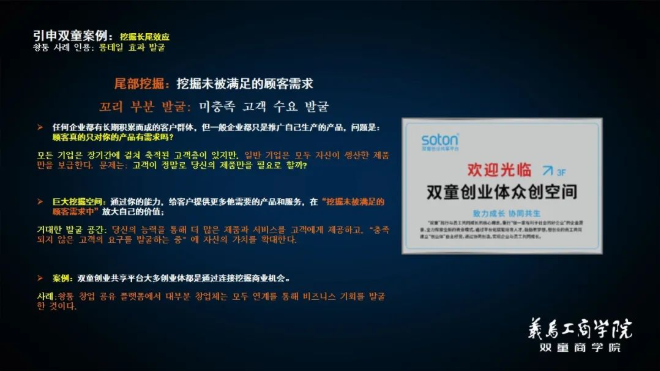 樓仲平課程分享ppt節(jié)選 從逆向思維、長尾效應到破界創(chuàng)新,在樓仲平引導下,北大學子被“與其更好、不如不同”的錯位競爭理念深深的吸引。而韓國的創(chuàng)業(yè)青年們也從中得到啟發(fā),圍繞自身優(yōu)勢,開始不斷思考和尋找未被發(fā)掘的市場需求。