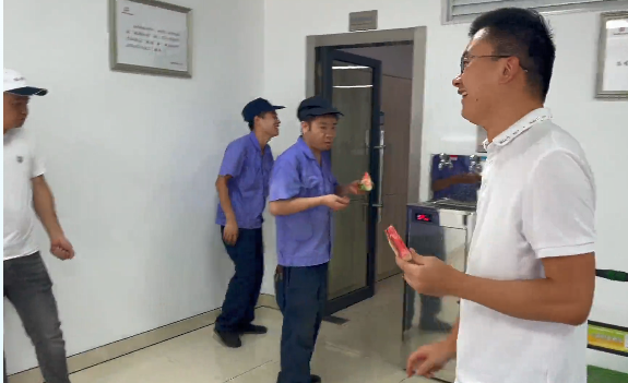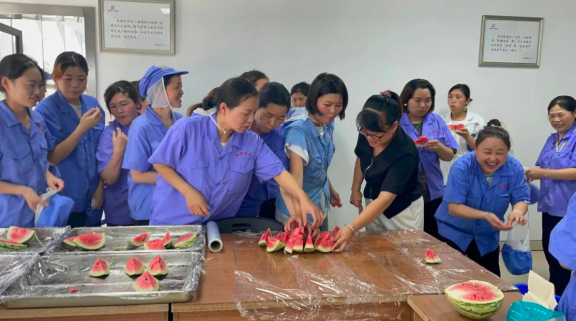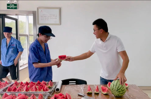 車間一線員工自然也不能落下,“雙童”總經(jīng)理李二橋親自上陣“殺”瓜,他還給大家透露,在他的安徽老家也有一片瓜田,論切西瓜,他可是專業(yè)的