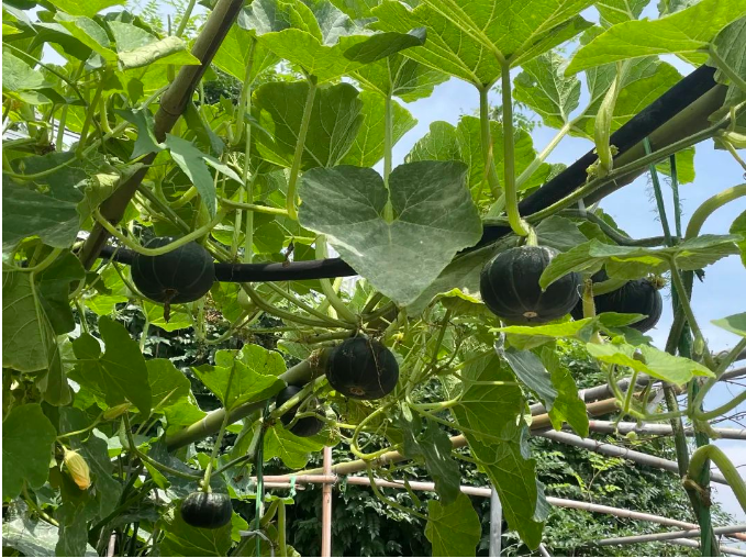 秋季不愧是收獲的季節(jié),在園丁叔叔的辛勤栽培下,空中菜園現(xiàn)在可謂是處處都是寶!看,這一大片的冬瓜像是通關(guān)游戲里的木樁似的,想過去這條路可還真的不容易。這細(xì)細(xì)的莖條還能掛住這么大的冬瓜,太牛了!