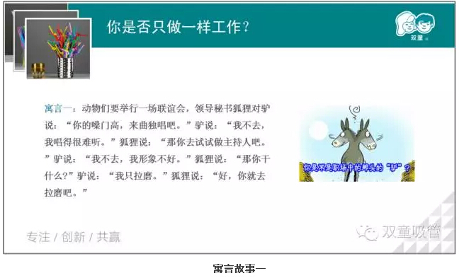 這位同學(xué)這樣說:”不光光是驢,其實(shí)我們每位員工都是需要想一想,在埋頭苦干的時候,有沒有提升自己的技能,而是原地踏步。只有不斷的進(jìn)步,才能不被社會淘汰。“