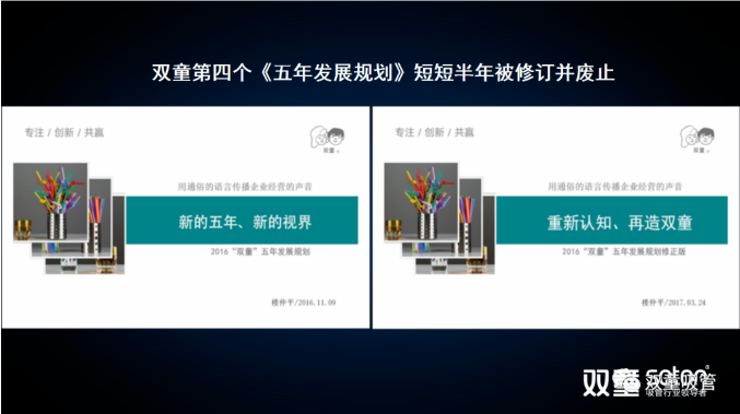 2010年,樓仲平在理解人性活力的“自然遞減”的現(xiàn)象以及經(jīng)理人老化自然規(guī)律后,下定決心通過《雙童五年發(fā)展規(guī)劃》的組織變革來實(shí)施解決“經(jīng)理人老化”問題:明確扶植年輕干部,選拔培養(yǎng)優(yōu)秀的年輕領(lǐng)導(dǎo)層,解決二代傳承接班等問題。