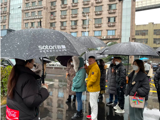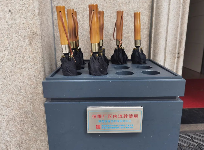 2020年4月,“雙童”董事長樓仲平注意到,下雨天總會有不少員工,因為忘記帶傘而被困在廠房和食堂里,無法出行,這樣不僅耽誤行程、影響工作進(jìn)度,冒雨而行還可能對健康不利。為此,樓仲平讓后勤部門定制了第一批流動雨傘,在一、二期廠房和宿舍樓下投入使用。