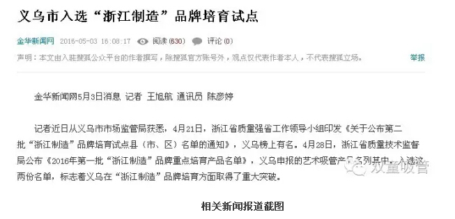 2014年底,浙江在全國(guó)率先以標(biāo)準(zhǔn)和認(rèn)證為手段打造首個(gè)區(qū)域性公共品牌——“浙江制造”品牌。“浙江制造”標(biāo)準(zhǔn)比國(guó)家及行業(yè)標(biāo)準(zhǔn)要求更高,達(dá)到國(guó)際先進(jìn)、國(guó)內(nèi)一流水平。4月28日,浙江省質(zhì)量技術(shù)監(jiān)督局公布《2016年第一批“浙江制造”品牌重點(diǎn)培育產(chǎn)品名單》,我們“雙童”代表義烏申報(bào)的吸管產(chǎn)品名列其中。標(biāo)志著義烏在“浙江制造”品牌培育方面取得了重大突破。