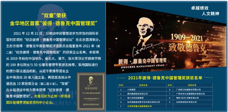 2021年12月21日,“雙童”榮獲金華地區(qū)首家“彼得·德魯克中國管理獎”。本獎項是由北大、清華、浙大等頂尖學(xué)府商學(xué)院的100多位院長與50位著名管理專家提名推薦,從近千家推薦提名企業(yè)中層層選拔從中遴選出10家獲獎企業(yè)。“雙童”是目前為止唯一獲得該國際管理界頂級獎項的中小企業(yè)。