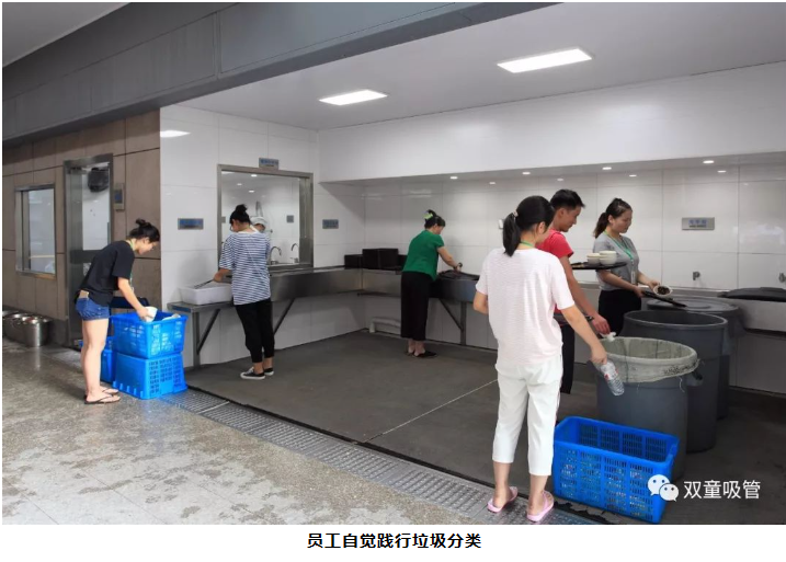 在“雙童”600余人就餐的員工餐廳里,濕垃圾也是“雙童”垃圾分類經(jīng)的一大重點(diǎn)!“五個碗”是雙童員工的餐具標(biāo)配,在每張餐桌上都擺放著用餐規(guī)范的標(biāo)語提示牌。