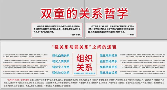 關(guān)系哲學(xué)強調(diào)要擺脫親情和人情的依賴、強化了規(guī)則和契約的認同。在正確理解信息化環(huán)境的彼此訴求下,“雙童”也逐漸建立起科學(xué)規(guī)范的組織關(guān)系:重規(guī)則、守契約、講創(chuàng)造、論績效、同理心、共成長,引導(dǎo)員工向職業(yè)化思想轉(zhuǎn)變。