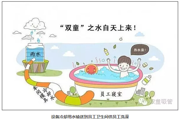 這些雨水在經過過濾后就可以作為消防用水、車間模具冷卻用水,還能用作車間洗衣用水和生活區(qū)用水呢!員工洗澡的熱水不耗一度電,不耗一度煤,全部是雨水收集好后,冷卻水在設備上形成的余熱水收集輸送到員工寢室。