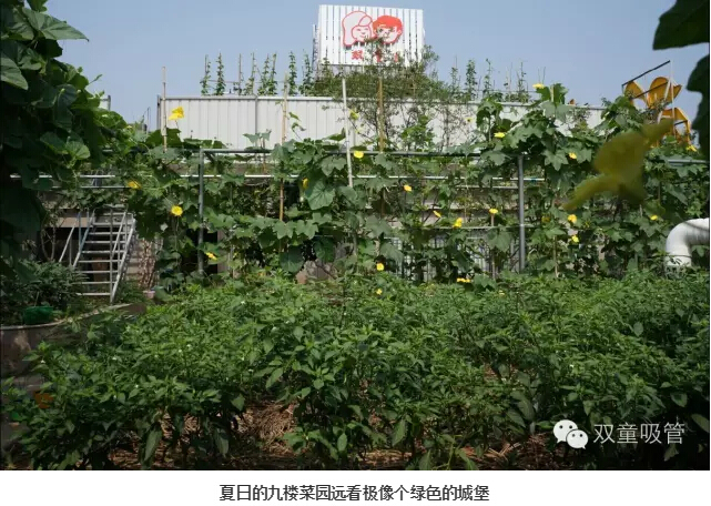 “雙童”的屋頂菜園有700多平方米,上下錯(cuò)落,分為四層,如同一個(gè)精致的梯田,到了夏日,濃蔭密布整個(gè)九樓菜園,遠(yuǎn)看極像一個(gè)綠色的城堡。