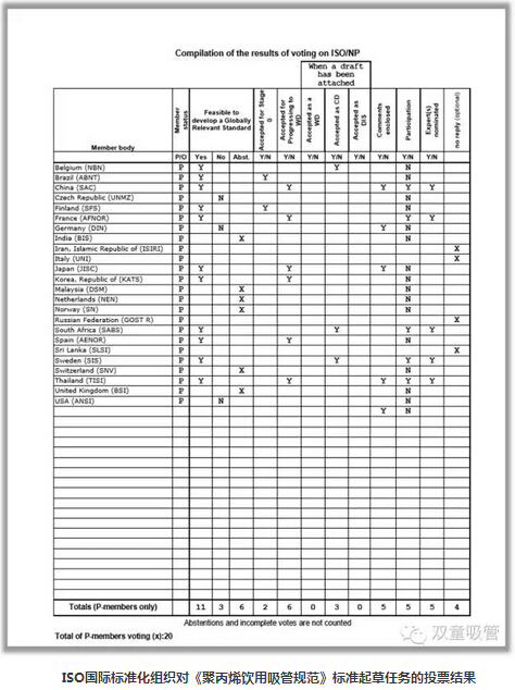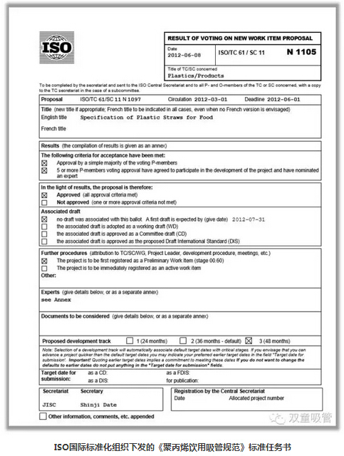 2008年7月,雙童在完成《聚丙烯飲用吸管》行業(yè)標(biāo)準(zhǔn)、國家標(biāo)準(zhǔn)的起草編制任務(wù)后,向ISO標(biāo)準(zhǔn)化管理組織申請了國際標(biāo)準(zhǔn)的起草制定任務(wù)。四年后,中國、泰國、瑞典、法國、南非五國組成的《聚丙烯飲用吸管規(guī)范》國際標(biāo)準(zhǔn)起草委員會(huì)成立。