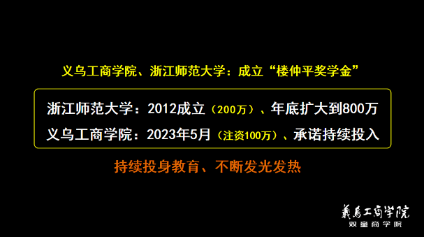 他還表示,好的企業(yè)一定會(huì)成為一所大學(xué)、好的經(jīng)營(yíng)者也一定會(huì)成為老師。樓仲平先后在浙江師范大學(xué)、義烏工商學(xué)院成立“樓仲平獎(jiǎng)學(xué)金”,并不斷增加投入資金,他將持續(xù)投身教育,不斷發(fā)光發(fā)熱!