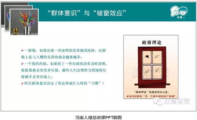 一個組織內部,如果有了一些垃圾而沒有及時清理,緊接著就會有更多垃圾,最終人們會理所當然地將垃圾順手丟棄在地上。所以群體意識決定了你會養(yǎng)成什么樣的“習慣”,而你的習慣也會影響著整個集體。