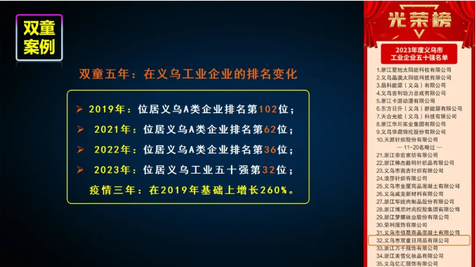 今年是雙童30周年,那么小的一個產(chǎn)品,我們把它做到了“義烏工業(yè)企業(yè)五十強”第32名,產(chǎn)品的質(zhì)量越來越好。這就是管理學(xué)轉(zhuǎn)化和應(yīng)用。這件事情看似是投入,看似一層一層所謂的我的善和我的愛,實則是我通過這種愛和善的方式交換了員工的心,交換了他們的付出,企業(yè)自然越來越好。
