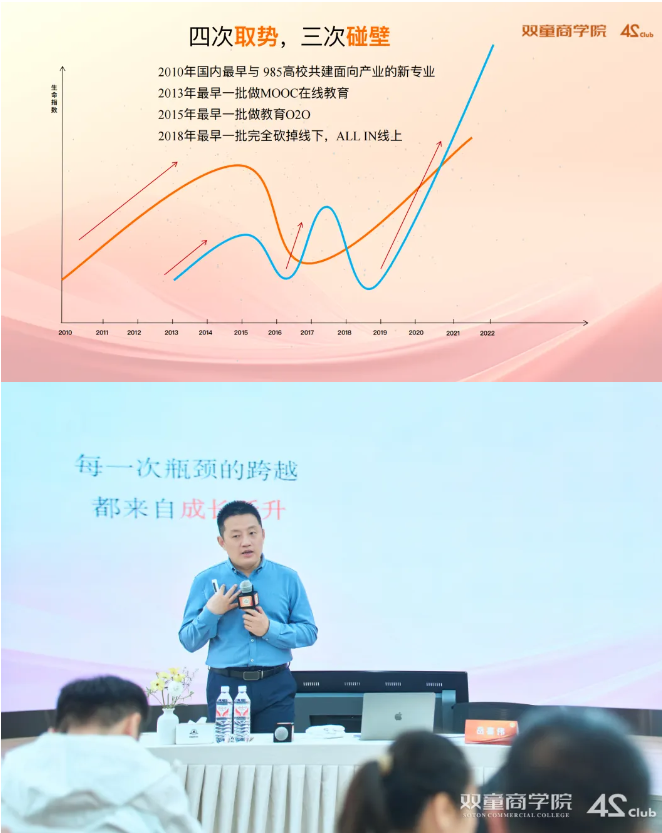 岳喜偉老師在課堂上分享了慧科集團(tuán)通過“四次取勢,三次碰壁”,花費6年的時間探索,才形成了企業(yè)的“第二曲線”,而這期間企業(yè)遇到的每一次“瓶頸期”和實現(xiàn)的突破都源自于創(chuàng)業(yè)者的認(rèn)知局限和成長躍升!