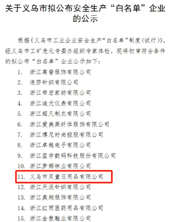 安全重于泰山,安全生產(chǎn)“白名單”企業(yè)這份榮譽,既是肯定,也是鞭策,在今后的工作中,“雙童”也會繼續(xù)做好安全學(xué)習(xí),努力增強員工的自我管理、自防、自救能力,樹立安全意識,共創(chuàng)一個安全、有序、高效的生產(chǎn)環(huán)境!