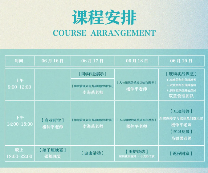 接下來,我們將進入【樓仲平隱形冠軍私享會】的下半場學習,新課題【組織保障】將于6月16日-19日正式開課。準備工作已就緒,期待各位同學“回家”!