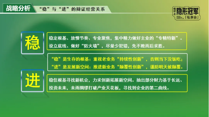 中國社會經(jīng)濟歷經(jīng)幾十年發(fā)展,經(jīng)歷了粗放經(jīng)營的“原始積累”階段,做強做大的“快速發(fā)展”階段。現(xiàn)階段已進入到“專精特新”轉(zhuǎn)型和創(chuàng)新階段,真正能挨過一個個經(jīng)濟寒冬并實現(xiàn)基業(yè)長青的企業(yè),一定是極致專注,并在某一細分領域處于絕對領先地位的隱形冠軍和產(chǎn)業(yè)小巨人。