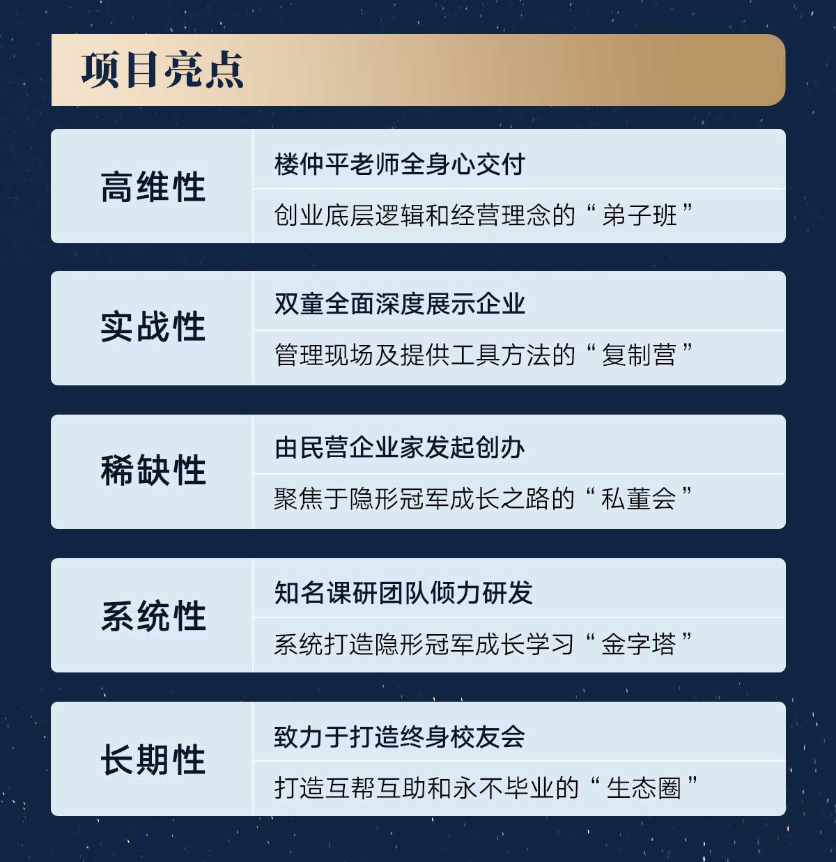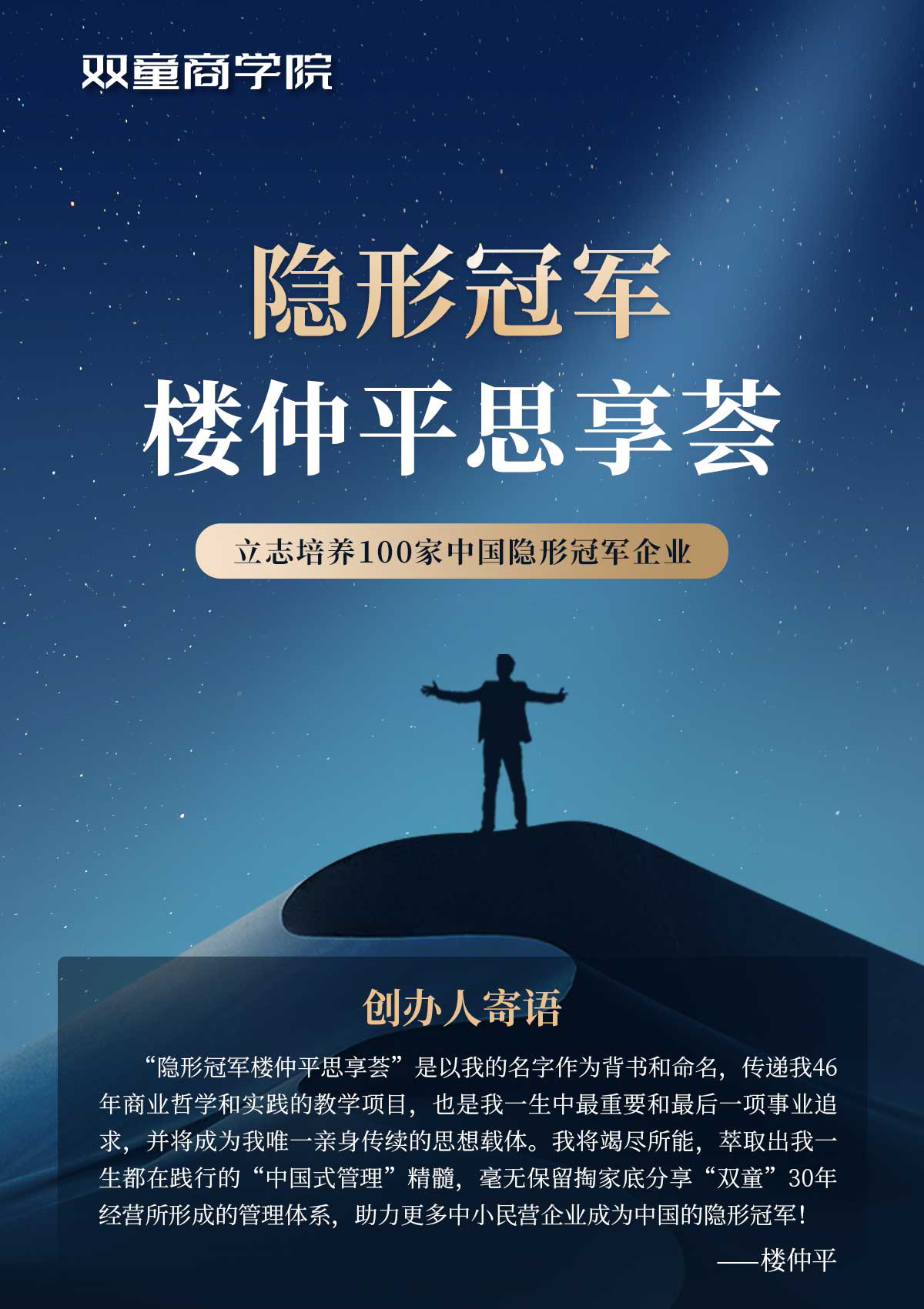 如果你是創(chuàng)業(yè)者、學習者、思想者,希望在經(jīng)營領域有自己的思考和洞察,那么《隱形冠軍樓仲平思享薈》就是為你量身定制,今年最后一期招生,一班只招40位同學,名額所剩不多,抓緊機會哦!